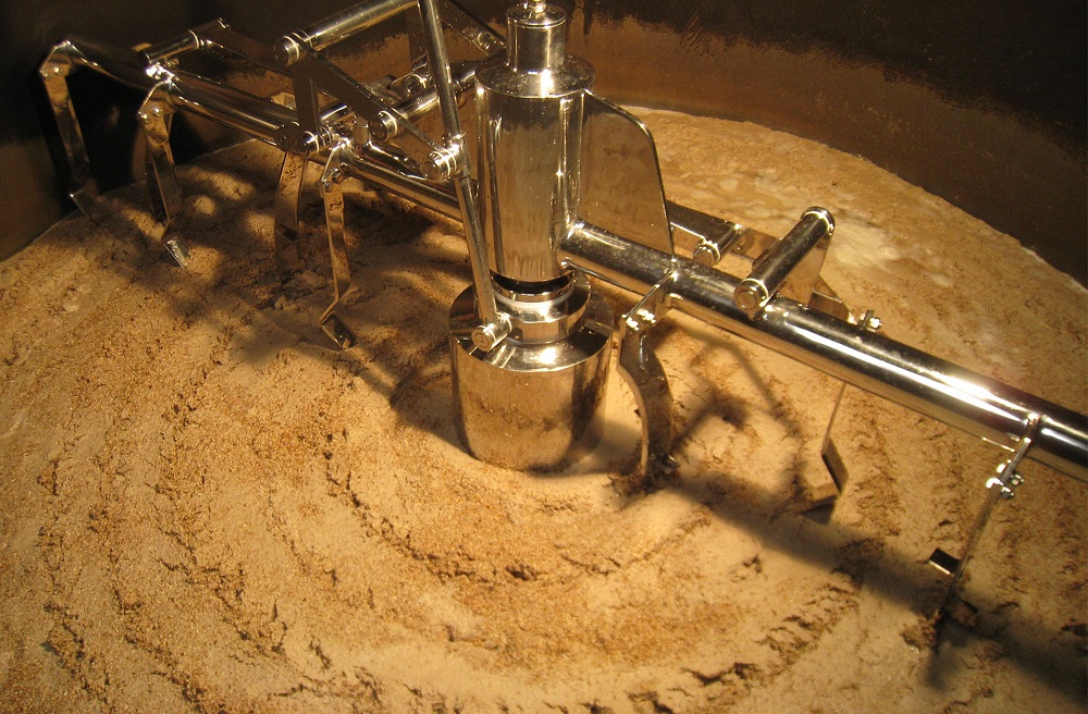 過濾罐中配備的耕刀裝置主要作用是用于疏松糟層,根據(jù)過濾壓差來上下升降,不是用來攪拌的。耕刀在過濾槽中轉(zhuǎn)動的速度很慢,十幾分鐘一圈。醪液泵入過濾罐后需要靜置15-20分鐘左右,麥皮會沉降,形成麥糟層。麥糟層底部主要是麥芽的粗粒和重粒;中間含量最多的是麥糟,即麥皮;上層則是醪液析出的蛋白質(zhì)和麥碎等輕質(zhì)顆粒。靜置時也要注意醪液的溫度,應(yīng)注意保溫。